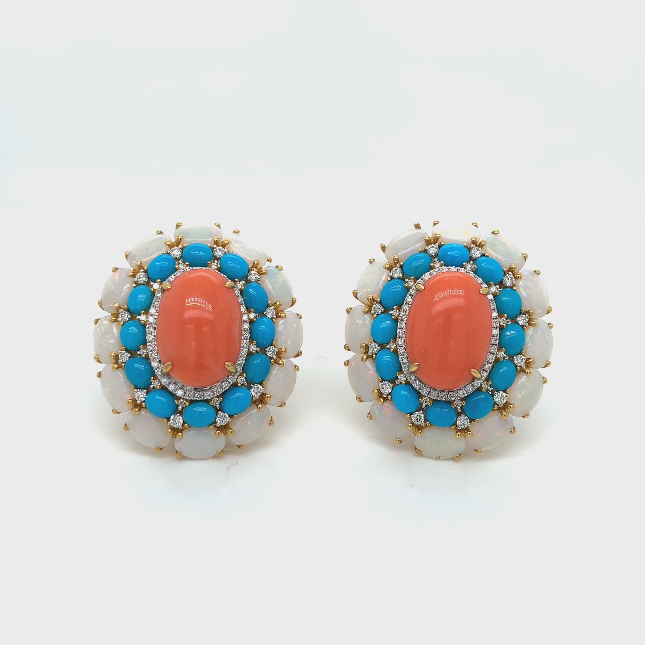 Yellow Gold Stud Earrings with Coral, Diamond, Opal, Turquoise Stones
